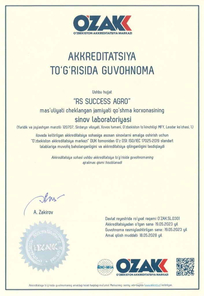 Первая в Узбекистане независимая промышленная испытательная лаборатория для сертифицированных исследований широкого спектра, созданная на базе  биотехнологического индустриального агрокомплекса RS SUCCESS AGRO, прошла Аккредитацию высочайшего международного уровня ISO/IEC 17025-2019. Соответствующий документ выдан специальным уполномоченным органом Республики Узбекистан – Государственным унитарным предприятием «Узбекский центр аккредитации».